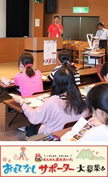 現在進行中のJRグループ「デスティネーションキャンペーン」も民間と協力し、平成25年度には誘致活動を行っていたことを紹介しました。観光素材の選定と開発、イベントの企画、おもてなし態勢の整備、二次交通対策など様々な準備があったそうです。また県は「おもてなし」参加を県民に呼びかけています。サポーター(写真をクリックすると募集ページをご覧頂けます)、トイレ美化、花いっぱい運動、観光案内所強化などです。渡辺さんは「(観光の波及効果で)携わる人々の生活が成り立つと地域が輝き、より地域が活性化するのです」と話しました。