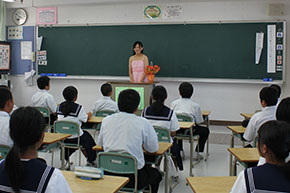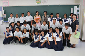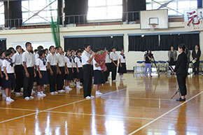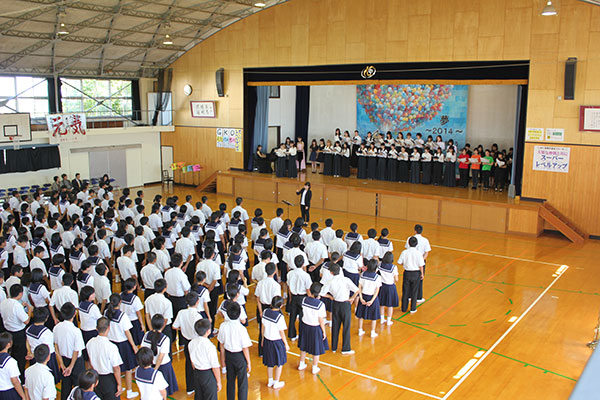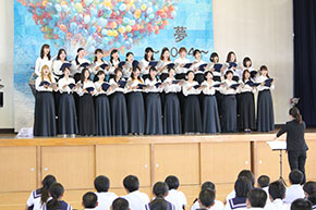 最後は国東中学校の校歌をみんなで合唱しました。そして生徒たちからお礼の言葉と花束を頂きました。学生にとって音楽家として聴いてもらう楽しさや難しさなどを実感する場になりました。
