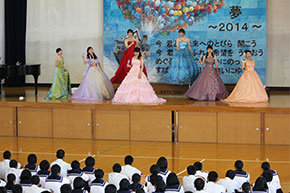 6月に国東中で教育実習を行ったピアノソロの小田さんは、演奏会後、教え子と再会しました。「とても緊張したけれど、皆さんの聴く態度がとても良かったので無事に終えることができました。拍手もありがとうございました」と挨拶をしました。教え子たちは「演奏会はすばらしかった」「良かった」「ドレスかわいい」などと感想を述べました。
