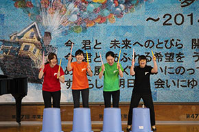 打楽器アンサンブルでは身近にあるバケツを楽器として活用。パワフルなリズムを刻み、素早いスティック使いも披露しました。ピアノ四重奏はドビュッシーの前奏曲集第2巻より「風変わりなラヴィーヌ将軍」をクラリネット、ファゴット、トランペット、ピアノで演奏。金管5重奏は「となりのトトロ」「小さな世界」を2つのトランペット、ホルン、トロンボーン、チューバでジャズ風にアレンジするなど、楽しさを演出しました。女声合唱の組曲「海の詩」より内なる怪魚[シーラカンス]では様々な海の音を披露。中学生は真剣に聞き入っていました。