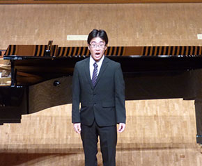 一番手はバリトン独唱の短大1年の松本利則さん。A.スカルラッティの「陽はすでにガンジス川から」とドナウディの「いつまた君に逢えるだろうか」を歌い、日頃の精進の成果を精一杯披露しました。その後、フルート、ソプラノ独唱、クラリネット、ピアノなど、学生たちが次々と見事な演奏を行いました。最後はピアノ独奏の専攻科2年・清水絵里さんがショパンの「ピアノソナタ第3番ロ短調Op.58」より「第2、3、4楽章」を披露して、演奏会を締めくくりました。様々な楽器と多様な曲目に会場は大きな拍手で包まれました。