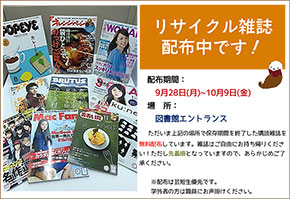 ただいま図書館エントランスにて保存期間の過ぎた雑誌を無料配布しています。気に入った雑誌が見つかった方はお持ち帰りください。(~10/9まで)