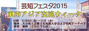 | 芸短フェスタ「東南アジア交流ウィーク」、11月6日(金)の19時に、芸文短大にて開会式を予定。7日(土)、8日(日)には大分県・芸術文化ゾーン(県立美術館と総合文化センター付近)にて、交流ワークショップ・展示・招待講演(明治大学・Prince of Songkla大学)を予定しております。最新情報につきましては、下記リンクを参照ください。 |