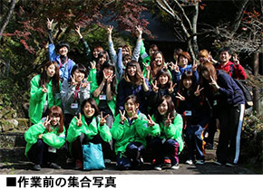今回は、総勢25名の学生と教員が参加しました。多くの学生が、羅漢寺へ行くのが初めて。また、これまでにお寺に行った事がある学生がいても、今回作業をする「参道」の存在を知らない人が多かったのです。