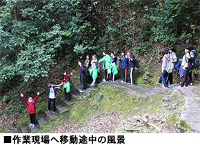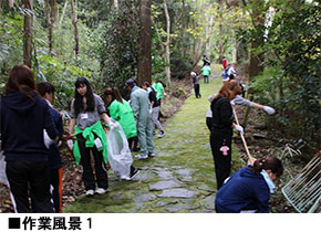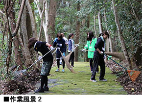 作業開始当初、全長800m以上もある参道を整備することに不安を持つ一同でしたが、活動が始まったとたん、黙々と作業に専念しました。作業終了後の太田氏のコメントの中にも「私は初め、参道全てを整備することができないのでは…と思っていましたが、全てやり遂げましたね。凄いことですよ!」と、私たちへ労いの言葉をかけてくれました。