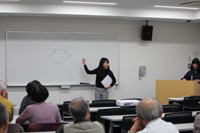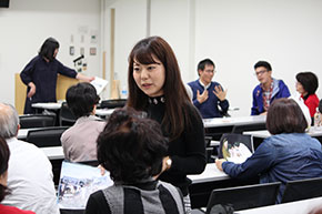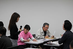 ゼミ生の池原あきのさんは「バングラデシュってどんな国?」をテーマに、バングラデシュの貧困と現状、文化や精神の豊かさなどを映像と写真そして現地のお菓子を使って紹介しました。映像の音声が流れないアクシデントもありましたが、動じることなくこれまで学んだことを話し、貧困と豊かさについて参加者に問いました。参加者は4つのグループに分かれ、それぞれ感じたことなどをまとめました。また、参加した元青年海外協力隊隊員の方が補足説明をしてくれたりして、参加者と学生が一体となり理解が深まりました。