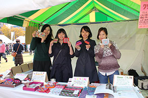 また、ホルトホール大分前の広場では、玉井ゼミ生と国際総合学科の学生たちがフェアトレードのお店を出しました。この物販では、東南アジアの難民キャンプなどを支援しているシャンティ国際ボランティア会(SVA)と連携。学生たちは東南アジア各地域の女性たちが作った多彩な手工芸品を販売し商品説明も行いました。収益は必要経費を除き、全てSVAを通して現地生産者に届け、現地での教育支援活動に使われます。