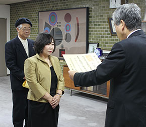 本学ではこれまで、38名の方々へこの称号を授与しており、今回は、本年3月に退職された国際総合学科 上野正二元教授、入野賀和子元教授へ授与しました。