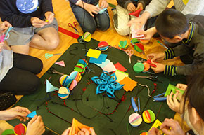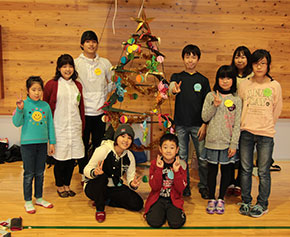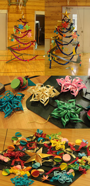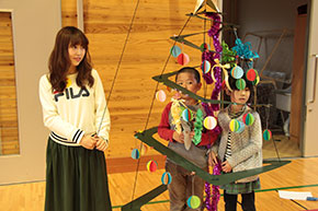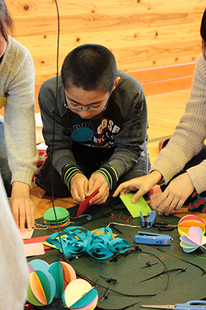 学生と小学生が4班に分かれて作業を進めます。色紙を折ってハサミで切れ目を入れたり、テープで貼り付けたりとみんな作業に熱中し黙々・・・。平面の紙を折ったり切ったり貼り付けたりの作業を繰り返すと、あら不思議、色紙はとても素敵なクリスマスツリーのオーナメントになりました!