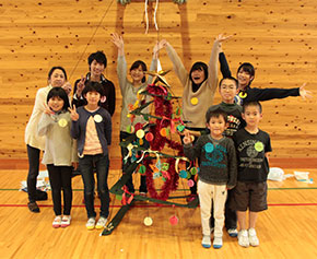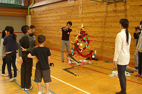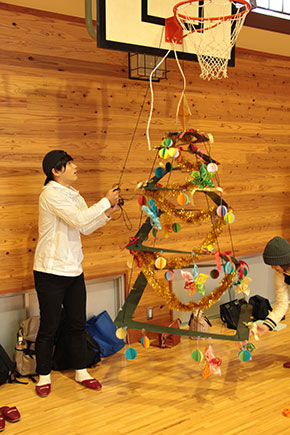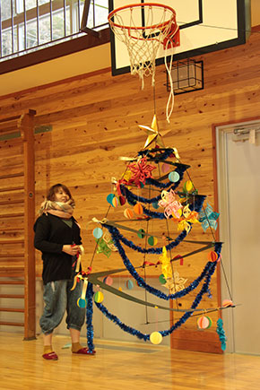 続けて平面の板にみんなで作ったオーナメントを取り付けていきます。時間もそろそろ押し迫る中、松本先生のかけ声とともにバスケットゴールに掛けられた平面の板は立体のクリスマスツリーに変身しました。らせん状に立体となったクリスマスツリーにみんなで作った色とりどりのオーナメントが可愛く揺れています。細かい作業を黙々と進めてきた子供たちは完成したクリスマスツリーを見て、みんな大喜びしていました。それから、それぞれの手形をかたどって作ったメッセージカードを作成しました。なんといっても「飛ぶメッセージカード」です!二つ折りした紙に片手の手形をかたどり、重りのシールを貼って完成です。6年生のお兄さんが作ったメッセージカードが、それはそれは見事に飛行して子供たちは大歓声を送りました。