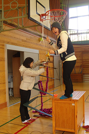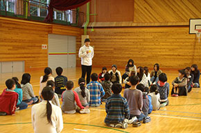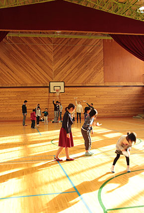 野矢小学校は1年生から6年生まで全校21名。ちょっと多い兄弟姉妹のように仲のよい生徒さんたちです。みんなの挨拶が気持ちいい~!!きれいな体育館で学生が準備を始めました。