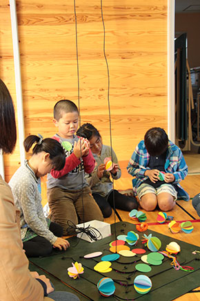 子供たちは興味津々、体育館の窓から中をのぞこうとします。「見ちゃダメ~!!」と芸短生、すでに和気あいあいの雰囲気です。さあ何ができるのでしょう。平らな板のように見える物に紐が付いています。