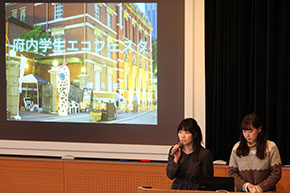 今年度で6回目となるエコをテーマにしたイベント。府内五番街全体を会場としています。企画・運営すべて芸文短大生が行います。企画会議は週一の学内会議のほか、府内五番街インフォメーションオフィスでも相談・会議も実施。PR活動ではTwitterやUstream配信のほか、大分駅前でビラを600枚配ったり、市内の学校にポスター掲示のお願いに行ったりと動き回りました。また、大分中央警察署で道路使用許可を申請、大分市役所土木課では道路占用許可の申請を行ったことやキャンドルの準備で九州乳業株式会社さんの協力を得たことなどを報告しました。