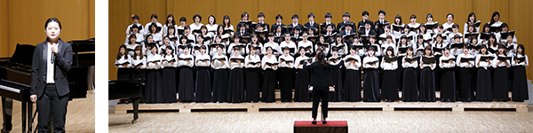 独唱は短大と専攻科の5名が出演。それぞれが培った歌声を響かせ、会場を沸かせました。合唱では専攻科指揮コース2年の宮腰花秀さんが指揮に。「バラエティーに富んだ5曲になっています。最初は静かで神聖なアヴェ・ヴェルム・コルプス。歌声を楽しんでください。2曲目は日本の曲を海外の人がアレンジした曲です。日本と違う感じです」などと曲の解説を行いました。また「試験期間と重なり練習の時間をとるのが大変でした」とも話しました。最後、オペラハイライトは専攻科の学生たちが熱演しました。ナレーションに映像、字幕と舞台に集中できる演出も。学生たちの磨き上げた歌声と演技に観客からは大きな拍手が贈られました。