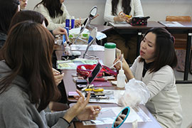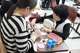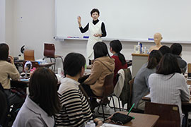進路支援室による就職試験勉強会「就活メイク講座」を2月18日(木)、開催しました。POLA畑中店の亀井店長はじめ4名のスタッフが講師となって、学生たちに“就活メイク”の手順や選ぶべきアイシャドー・チーク・口紅の色のほか、お肌についてレクチャーしました。