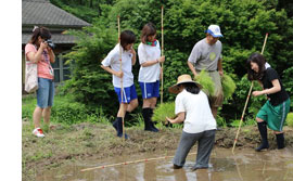 大分市でも過疎化が進む周辺農村。学生が手伝うことにより、地域を活性化することはできないか、楽しみながら地域活動する「地球の小っちゃな田ノ口で遊ぼう」の活動を行っています。