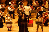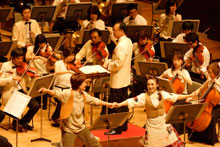 前半は、森口准教授の指揮によるオーケストラ演奏で、魔法をテーマにした管弦楽曲を3曲演奏しました。当日会場は、ファミリーコンサートということで、子ども連れが多く、親子で一緒にコンサートを楽しんでいる様子があちこちで見られました。森口准教授は、曲の合間には、子どもたちにもわかるように曲目解説を加えながら進め、「あなたも指揮者コーナー」では、くじ引きで選ばれた5歳ほどの小さな子ども相手に、苦戦しながら指揮の指導も行っていました。指揮をする小さな子どもの真剣な姿とほほ笑ましい仕草に会場はあたたかい拍手で包まれました。