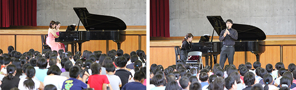 ピアノソロでは、『赤とんぼ』や『トルコ行進曲“ジャズ”』を、連弾では『おもちゃの交響曲』などを披露、児童たちは聴き入っていました。