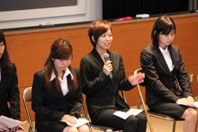 「就活をふりかえってみて」「それぞれの企業・業界を選んだ理由」「エントリーシートや履歴書を作る際に工夫したこと」「集団面接でのエピソード」など具体的な内容に、いままさに就活で頑張っている学生たちはメモをとりながら、真剣に聞き入っていました。