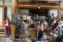 このイベントには、地区の内外から、多くの参加者や見学者が訪れていました。会場のお寺のお堂にズラリと見物人たちが並び、行司役は豊岡住職や区長さんが務めました。本学の学生も25名が参加、会場の片付けや写真撮影・取材などを行いました。