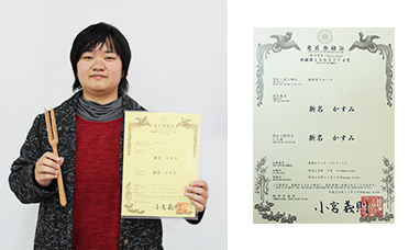 文部科学省や特許庁などが主催する「平成27年度デザインパテントコンテスト」で入選し、今年3月に意匠登録出願を行った新名かすみさん(専攻科・造形専攻1年)のデザインが特許庁の審査を経て意匠登録され、意匠権の登録証が届きました。