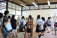 「学科紹介」「学科入試説明会」「在学生によるキャンパスライフ紹介」「授業風景・取り組みなどのスライド上映」「学科施設見学」などを行いました。美術科は午前中から教室・工房等を開放、施設内見学やシルクスクリーン、パソコン操作などを体験するワークショップを実施しました。「在学生によるキャンパスライフ紹介」では、現役学生らがスライドを使って授業や制作風景をはじめ、登校時やランチタイムの様子など学生生活の様子を紹介しました。