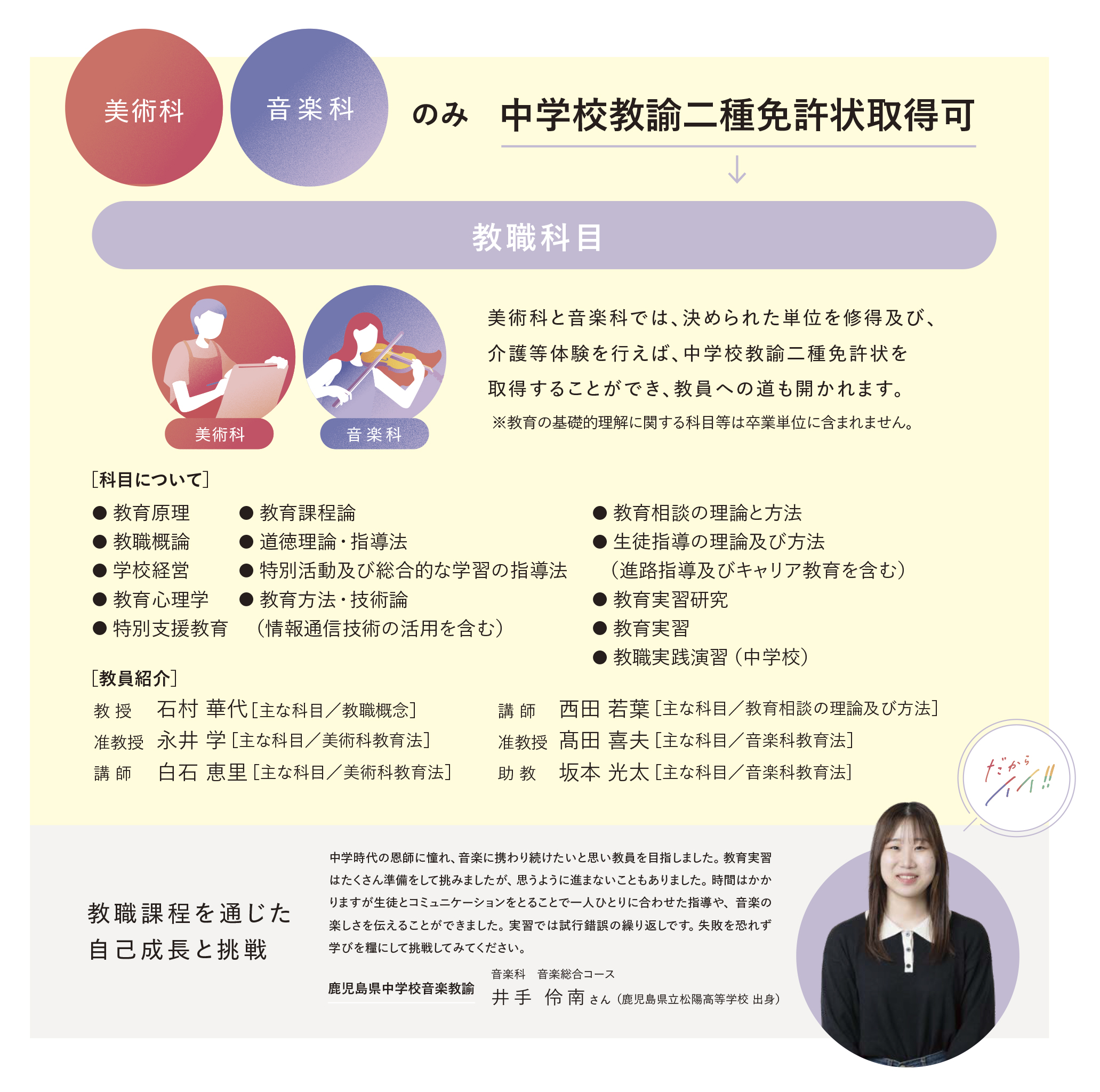 美術科と音楽科では、決められた単位を修得すれば、中学校教諭二種免許状を取得することができ、教員への道も開かれます。※教職に関する科目は卒業単位に含まれません。