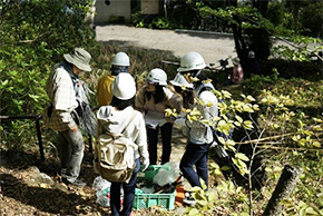 学生たちは森の清掃などを行い、野草の天ぷらをごちそうになりました。