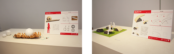会場には持ち運べるフルーツボウル(ダンゴムシから発想!)や、だらしない姿勢を肯定する椅子・・・など、学生らしいユニークな発案の作品や、車道を横切らずに歩道橋を利用してもらうためのデザインの提案などが展示されています。