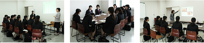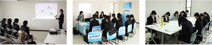 春休みの中、115名あまりの学生が参加し、午前中は企業・団体によるプレゼンテーションを聴き、午後からは各教室に分かれて、それぞれの企業ブースを訪問しました。学生たちは、メモをとりながら熱心に企業・団体の説明を聞いていました。