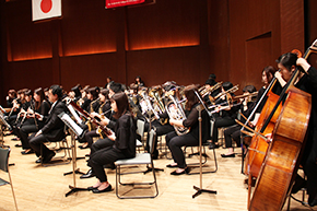 開会に先立ち、音楽科の在校生が演奏する真島俊夫作曲「ウェルカム」、宮川成治「J-BEST 桜ソングメドレー」、福田洋介「さくらのうた」、西山知宏「マーチ『春風の通り道』」の吹奏楽で、新入生を歓迎し、新入生たちは先輩たちの迫力ある演奏を熱心に聴き入り、凛とした空気の中で式は進行されました。