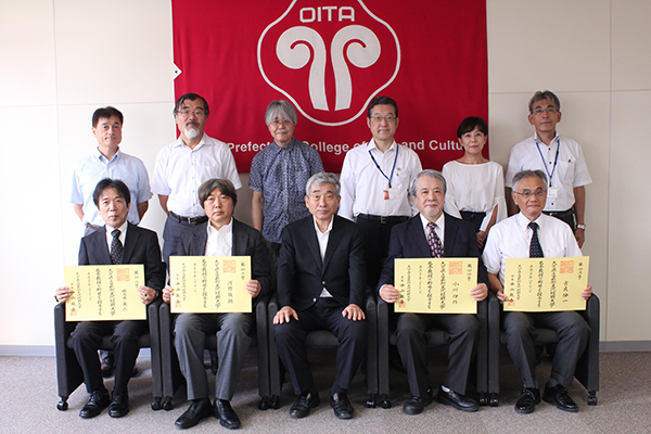 本学ではこれまで、41名の方々へこの称号を授与しており、今回は、本年3月に教授として退職された美術科 根之木英二氏、音楽科 河野敦朗氏、同科 小川伊作氏、情報コミュニケーション学科 吉良伸一氏に授与しました。