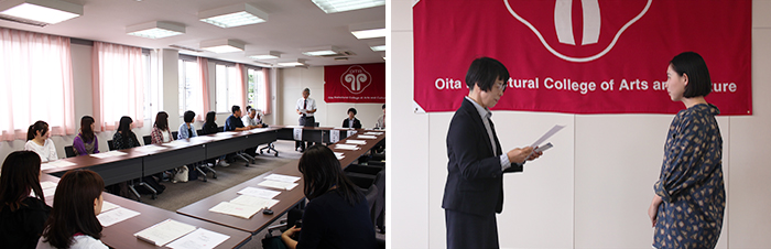 9月27日(木)、大分県共同募金会の方々にお越しいただき、本学でプロジェクトのキックオフセレモニーを行いました。中山学長の挨拶の後、大分県共同募金会の常務理事 吉田氏から「赤い羽根共同募金」の概要等についてお話いただき、今年のデザインを担当した美術科デザイン専攻プロダクトデザインコース2年の山中ももさんへ感謝の手紙もいただきました。