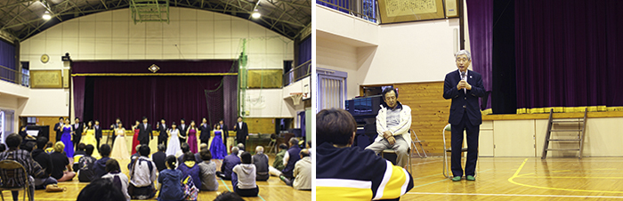 今年は本学から学生・教職員合わせて約50名が参加。交流会の開会行事は体育館で行われ、本学オペラサークル「Opera piena di Vita」の皆さんの華やかな歌声がオープニングを飾り、本学長から参加者の皆さんへ挨拶を行いました。