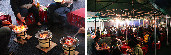 開会行事後からは地元の牛肉と野菜でBBQが始まり、地元の方々が準備したおにぎりやだんご汁をいただき、学生たちは大分の郷土料理を味わいました。本学の卒業生達も集まり、会場は同窓会のようでした。