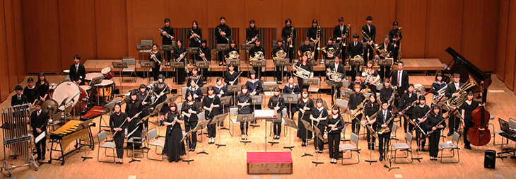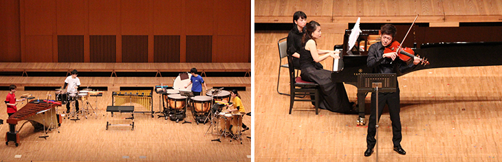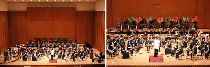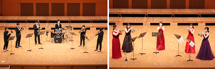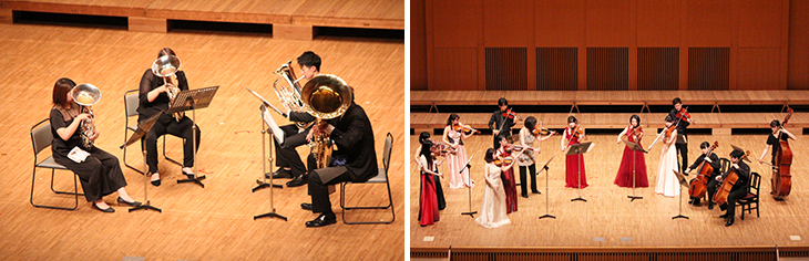 第1部では打楽器、ユーフォニアム・テューバ、弦楽、トロンボーン、トランペットの各アンサンブルと、音楽総合コースで作曲を専攻する学生の作品(ピアノ・ヴィオラ)を披露しました。第2部では吹奏楽編成(指揮:森口 真司 教授)により多彩な曲目を披露しました。