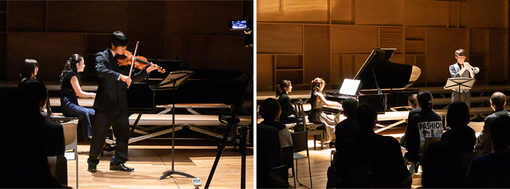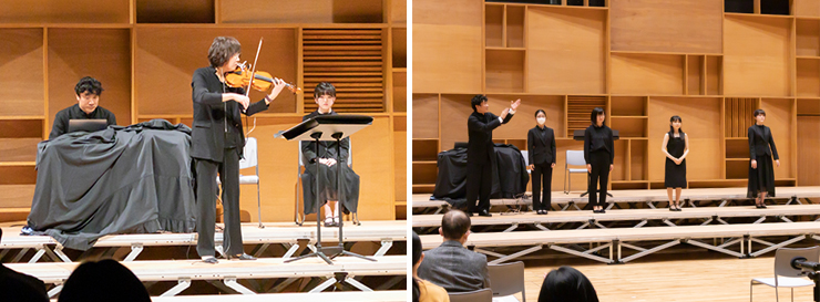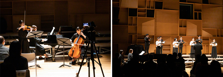 当日はアンサンブル演奏や合唱表現、電子音響とバイオリンによるオスティナート演奏など、普段とは違う学生と教員の個性が光る曲の数々が披露され、来場者を楽しませました。