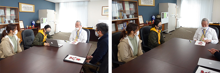 この企画を実施した美術科2年廣田百恵さんから、キャラクター決定までの経緯の説明の後、黒崎さんからデザインに込めた思いやキャラクターの場面に合わせた表情などについて報告されました。