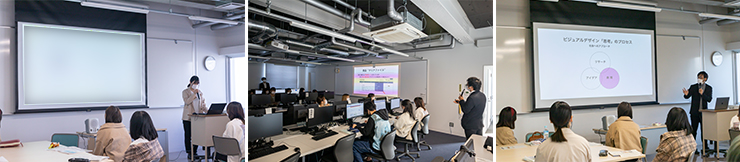 プレゼンテーション終了後には、情報コミュニケーション学科野田准教授によるJ-PlatPatを使った商標調査について、また西口准教授より配置と配色などのデザインの基礎についてレクチャーがあり、学生は熱心にメモを取っていました。