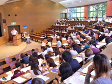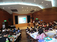 まず、本学の進路支援室スタッフより就職活動の概要、進路支援室の利用案内、今後のガイダンスや学習会のスケジュール、4年制大学の3年次編入などについての説明がありました。1年生にとっては、入学してわずか半年で卒業後の進路を考えることに戸惑いがあるかもしれませんが、ガイダンスを通じて就職活動開始が間近に迫っていることを実感したのではないでしょうか。