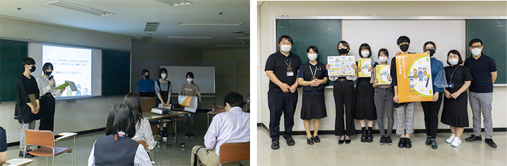 西口顕一准教授は「どうやれば情報が伝わるのかを、学生中心に考え作成しました。大学で学んでいることを発表する機会をいただけて感謝します」とあいさつ。学生は「認知症について、当初は『忘れやすい』という知識だけでしたが、支える側の様々なことを知り勉強になりました。今後自分が実際に支える側の立場になった時に進んで対応できるようにしたいです」と話しました。