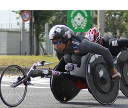 A.出場しようと思ったというよりも、始めようと思ったのは、入院してた時のリハビリの先生(のアドバイス)。リハビリってすることがなかったんよ。もう背骨がひっついて、動けるようになった時から車いす自分で乗れてたし、体操やってたから、手の力がもともとあって、だから普通は車いすに乗るための訓練をしたり、バランス感覚を養って・・・ていうのもすべて出来てしまってたんで、病院ですることがないと。それで病院の先生が「車いすでもスポーツができるから見学に行こう」と、スポーツセンターに連れて行ってくれて、でみんなが走っている姿を見て「あ!おれ、これやる!」って。もうその入院中にひまつぶしじゃないけども、退院するまでの間、体を鍛えるために先生はそういうスポーツの世界を見せてくれたんやと思うけど。で、まあそうやってスポーツができるっていうのが分かってからは、もう実際8月くらいに陸上始めだして、初めて出たのが年明けて3月のハーフマラソンで、4月にはフルマラソンに出てしまってるんで。だから「どこどこの大会を目指してがんばるぞ!」とかそんなんは特になく、やりだしてその距離が走れるようになったから出た。ってそんなカンジ。