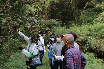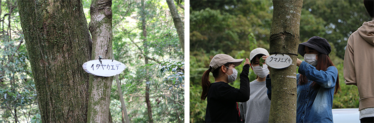 同地区は、大分市にあっても高齢化と人口減少が進んでおり、週末などに都市部から人々に訪問してもらって交流人口を拡大させることで地区の維持・存続を図ろうとしています。今回は、地区内「くりはい遊びの森」において樹木調査を実施して、銘板を設置する作業を支援しました。