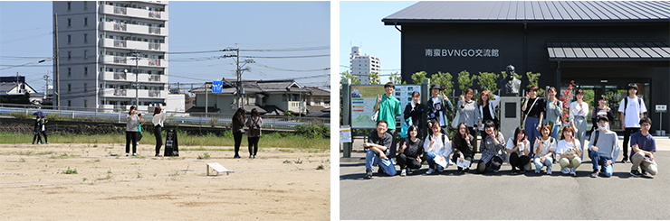 2つのグループに分かれて大学から徒歩で大分川に向かい、川の河口までごみを拾いながら歩きました。大分川の川沿い、特に大学の近隣地帯は、大友宗麟が九州6か国の守護職を得た際の政の中心地であり、歴史的に極めて重要な役割を果たしていました。また大友氏はこの時代に、南蛮貿易を積極的に行い、キリスト教信仰をはじめ、西洋医学や文化、最新技術をも多く取り入れたことでも有名です。学生たちは、これら国際貿易都市であった豊後(府内)の特徴について随所で説明を受けながら、清掃活動を行いました。