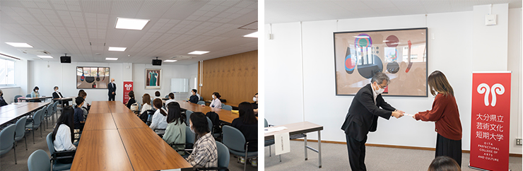 本学学生・教職員など関係者ら20名が出席し、セレモニーでは、共同募金会の 佐藤 文博 常務理事から「芸文短大の皆さんにご協力いただき、今年もボールペンが完成し、すでにお問い合わせをいただくなど、この活動が定着している。これからも募金への参加・支援にご協力いただきたい」とのあいさつをいただきました。