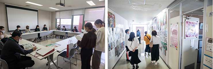 当日は人文系、芸術系の2学科ごとに午前と午後に分かれて実施し、4学科の学生有志10名が分担し、自ら所属する学科の特色や施設について、活動を織り交ぜながら案内しました。