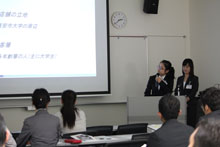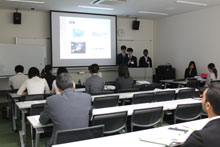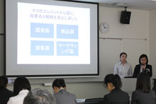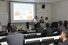 公開プレゼンテーションでは、「インターネット販売の国別の顧客動向について」「企業における海外交流の必要性について」「インターネット販売におけるブランドイメージ戦略」「中国へスイーツのお店を展開する戦略」「カフェをより良くするための改善提案」について、留学生らが発表を行いました。今回は、日本人学生の応募もありましたが、選考の結果、留学生のみの発表となりました。