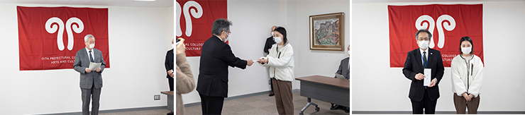 小手川学長からのねぎらいの言葉のあと、プロジェクトメンバー代表学生が、お招きした社会福祉法人大分県共同募金会の佐藤文博常務理事に募金の目録を手渡しました。