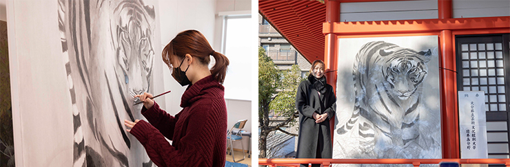 若宮八幡社(大分市上野町)周辺自治会から依頼を受け、専攻科造形専攻1年生(日本画専攻)の徳重 麻友さんが、2022年の干支「寅」の絵馬を制作しました。絵馬制作にあたっては、自然動物公園アフリカンサファリなど県内外の動物園で本物のトラを充分観察し、様々な表情をスケッチしながら構想を練ったそうです。