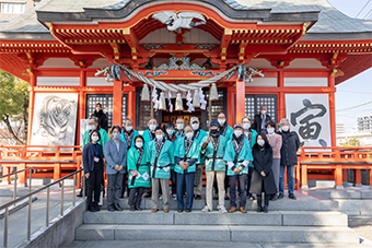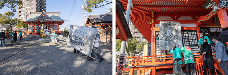 12月15日(水)の「干支絵馬奉納奉告祭」には、徳重さんと担当教員 永井学准教授が招待され、出席しました。奉納神事で、同社氏子総代会の林信一郎さんが「絵馬が奉納され、新年を迎える準備ができ、大変うれしく思う。来年がトラのように前に進む一年になるよう願っている」とあいさつし、参加した地域の皆さんと完成を喜びました。